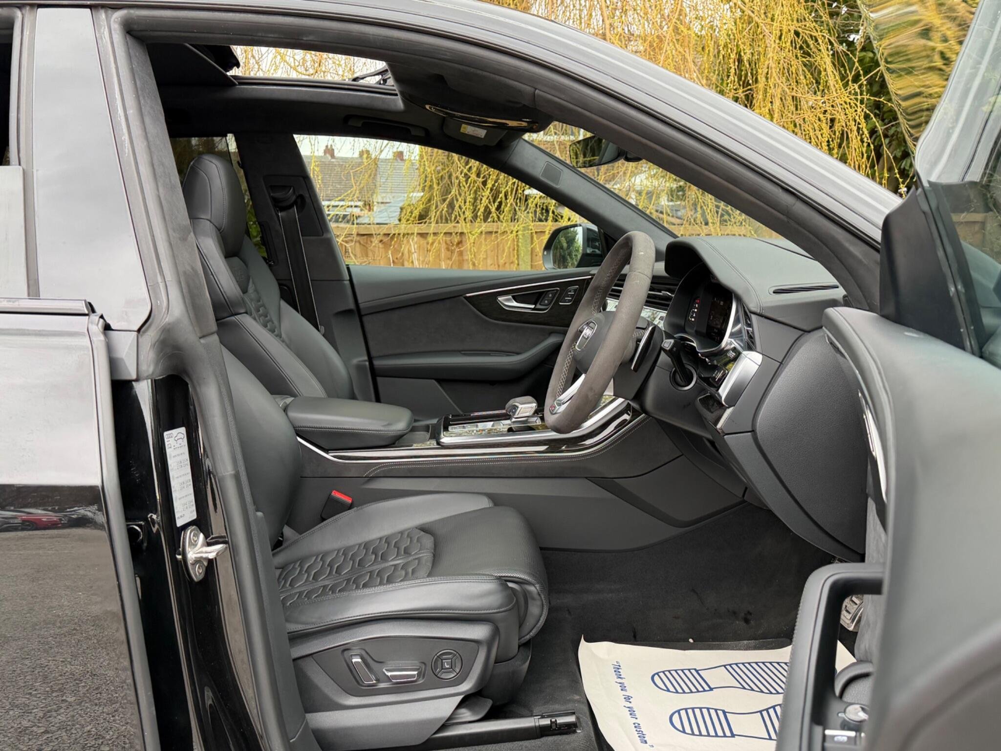 1 FORMER KEEPER|FULL AUDI SERVICE HISTORY - SERVICE INTERVLS @ 10,148 & 13,820 - BRAKE FLUID SERVICE DONE @ 13,820|24" VOSSEN URBAN ALLOYS + FULL MAXTON BODYKIT| This 2023 Audi RSQ8 TFSI V8 Vorsprung boasts exceptionally low mileage for its year, having covered just 14929 miles. As a Euro 6 compliant model, it features a powerful 4.0 litre V8 petrol engine paired with Audi's renowned four wheel drive system, ensuring impressive performance and handling. The Vorsprung trim level signifies a high specification, and this particular example includes desirable features such as the Parking System Plus with a 360 degree display, offering comprehensive visibility with front, rear, and side sensors. Enhancing the driving experience further are the Head Up Display and a panoramic glass sunroof, which can be opened for an airy cabin feel. Automatic lighting is managed by the light and rain sensor, complemented by striking Audi HD Matrix LED headlights in RS specific design with dynamic front and rear indicators. The RSQ8 is designed for both exhilarating driving and everyday practicality. Its acceleration is a standout feature, capable of reaching 0-62mph in a swift 3.8 seconds, demonstrating its potent V8 engine. This performance is matched by its utility, offering substantial boot space for all your needs. Furthermore, the vehicle is equipped to handle significant loads, with a towing weight of 3500 kg. These attributes, combined with its advanced technology and low mileage, position this Audi RSQ8 Vorsprung as a compelling choice for those seeking a blend of dynamic capability and refined luxury. -